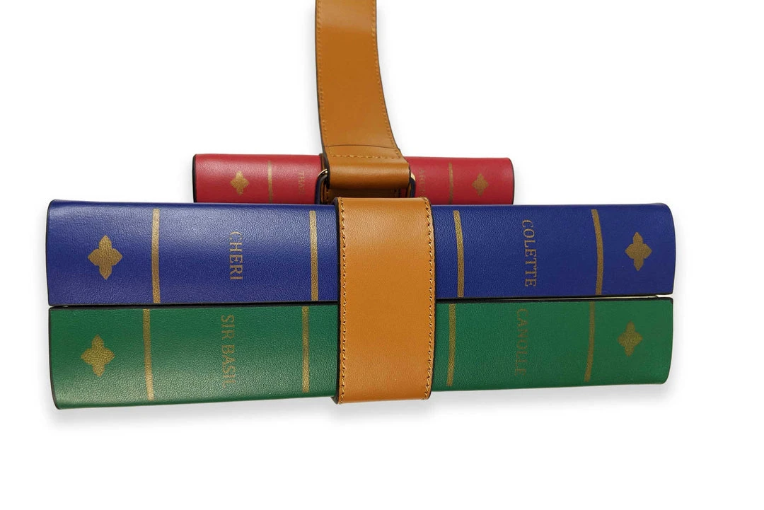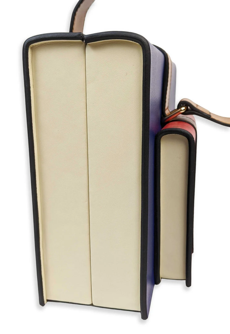 This unique faux leather purse is sure to be a conversation piece wherever you go. Contains two large books in cobalt blue and forest green and a small book in red. The larger books open to reveal a spacious off-white interior with a small pocket. A cognac brown book strap acts as a two-position adjustable handle.