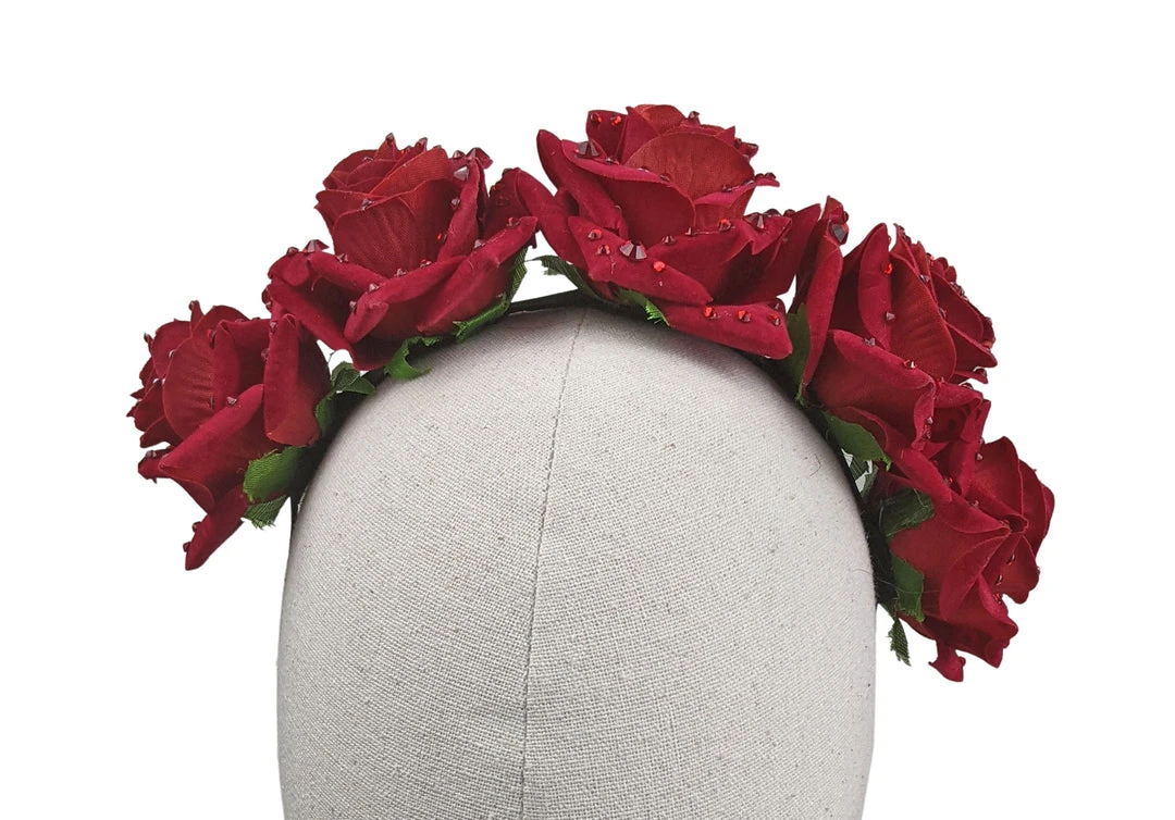 A light and flexible elastic strap headband with five lush red fabric roses. Hand placed rhinestones make each a one of a kind creation.