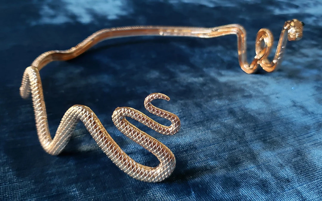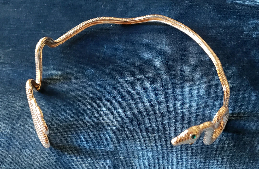 The “Delilah” Snake Bandeau head band – Unique original design with a golden snake and emerald green rhinestone eyes. The snake’s head and tail rest at either side of the head at the temples.
