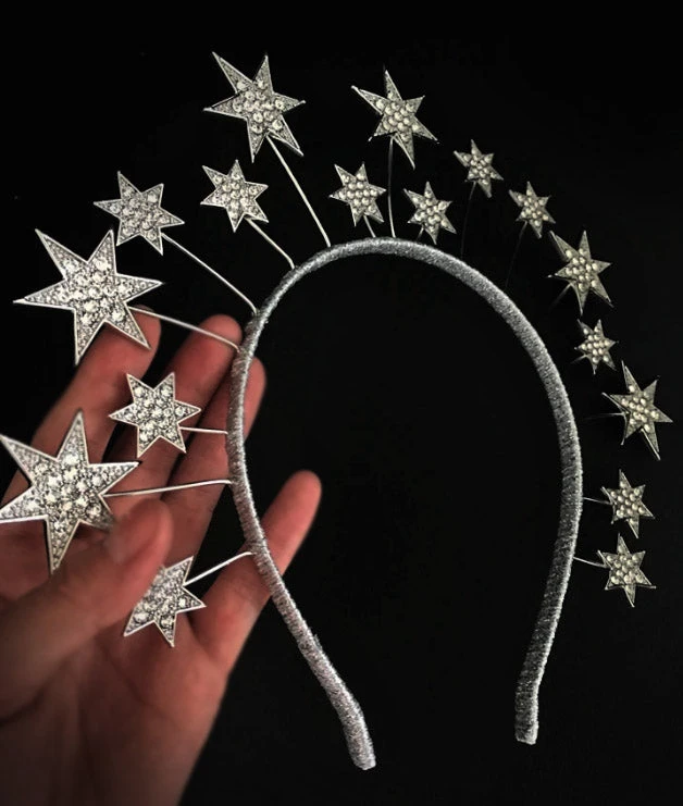 This piece features a variety of stars on the headband, hand wrapped in silver-tone metallic ribbon. Numerous pave rhinestones glitter at different levels to create this dramatic headpiece.