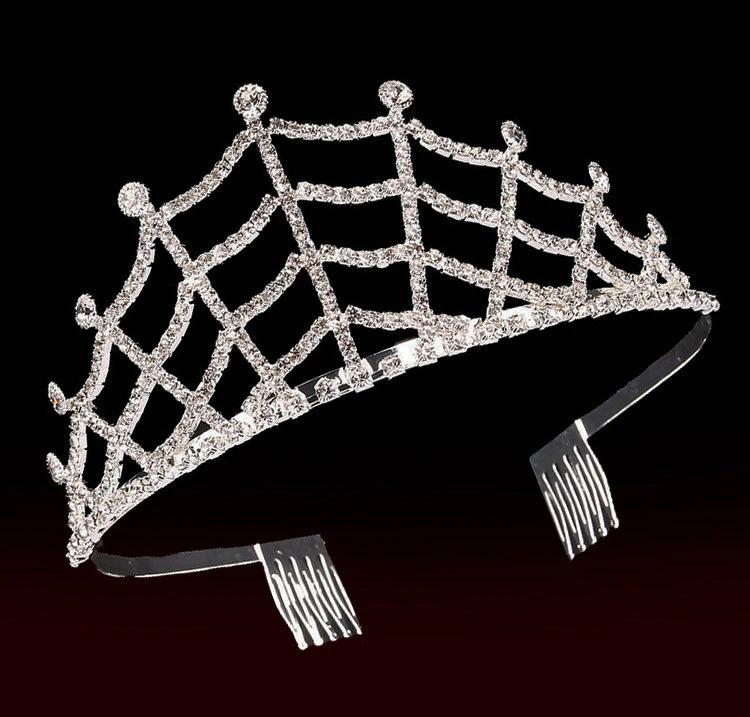 The “Ida” spiderweb tiara is a silver toned diamante crown reminiscent of ones worn in the 1940s and 1950s. The tiara is comfortable and light-weight. It secures to the head with combs at the back of arms of the tiara.