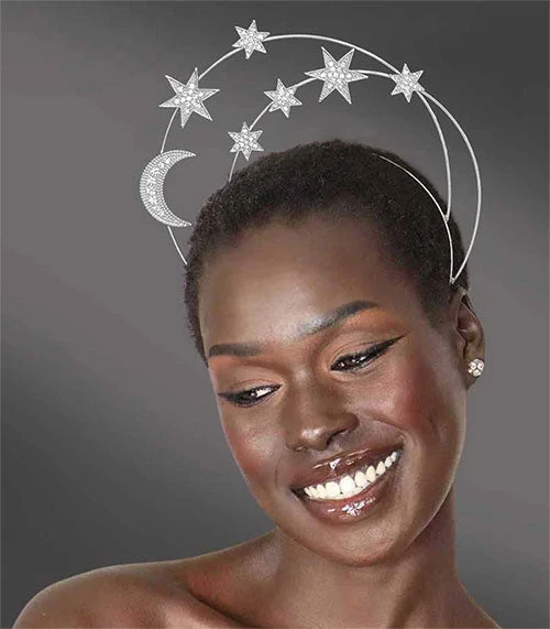 The Apollina features a graceful shape halo that holds a pave crescent moon and stars.