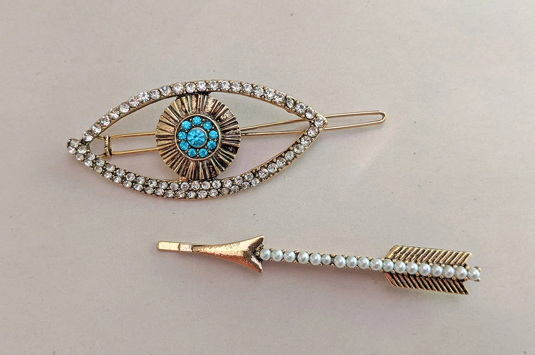 The “Mae” set includes a lovely gold-tone arrow hairpin accented with faux pearls plus an eye barrette with a turquoise colored center accented with rhinestones.