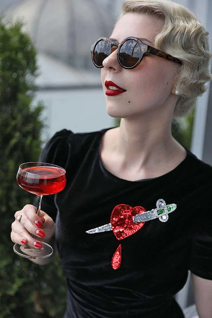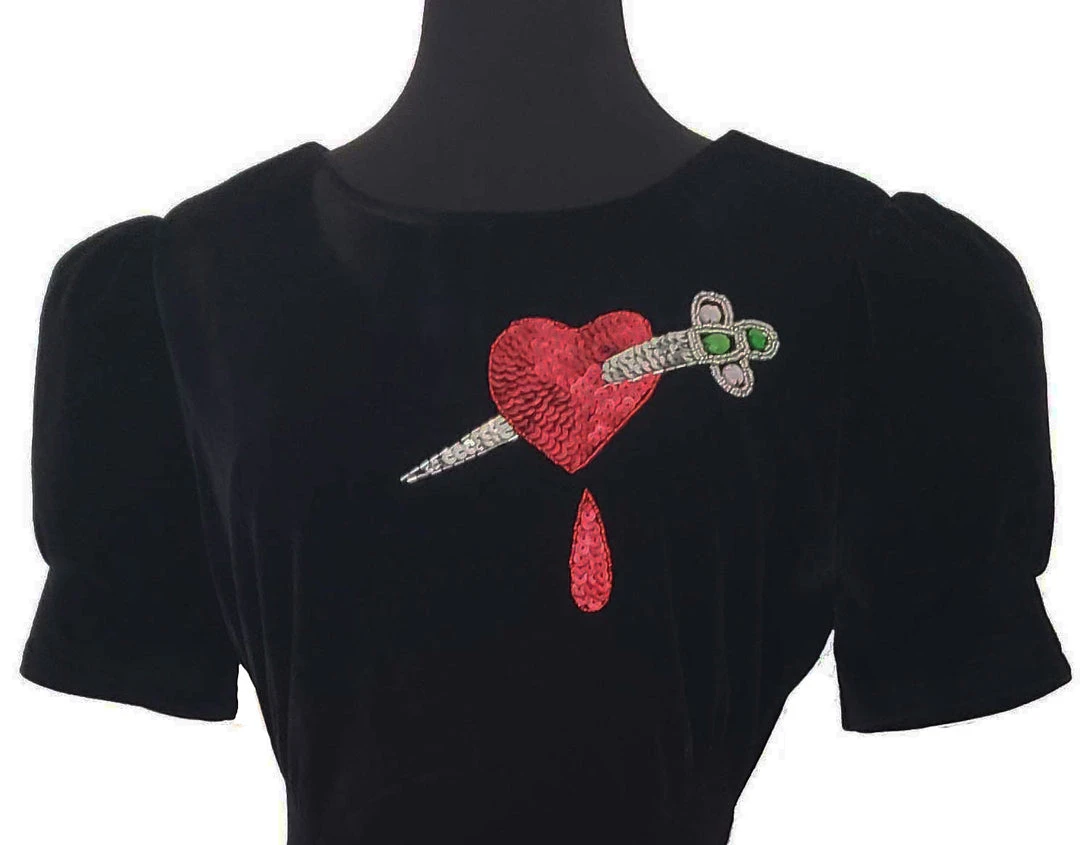 The Jezebel dress features a hand sewn applique featuring a jeweled dagger piecing a bleeding heart inspired by the “Jezebel” sweater created by 1940s sweater designer Suse.