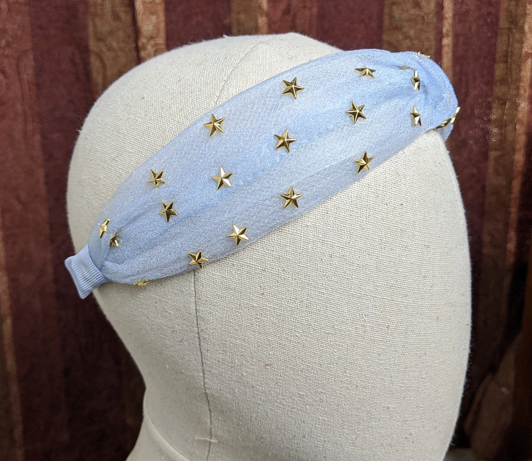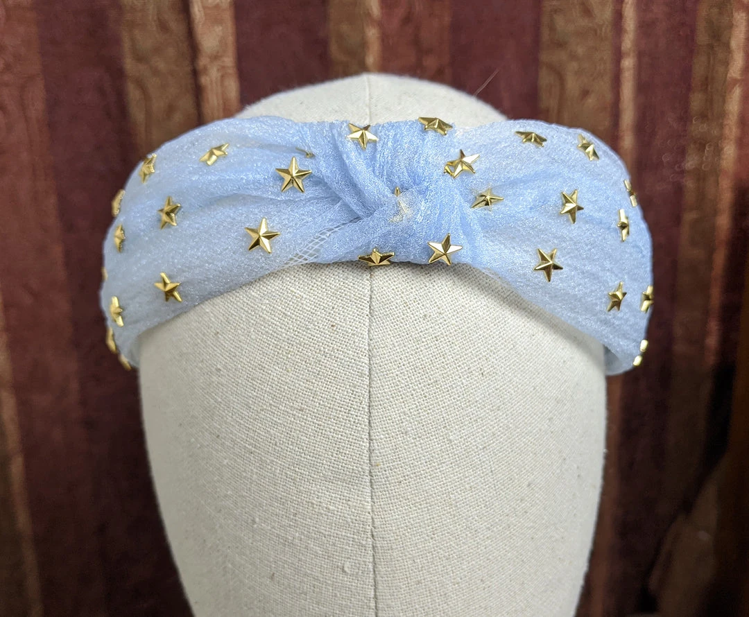 Tulle headband studded with stars with a top knot in the middle. Available in black, powder blue, seafoam, and rose pink.