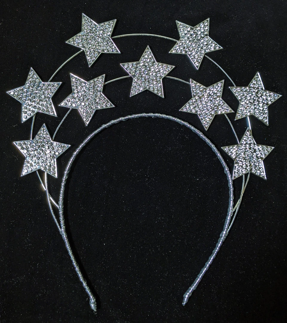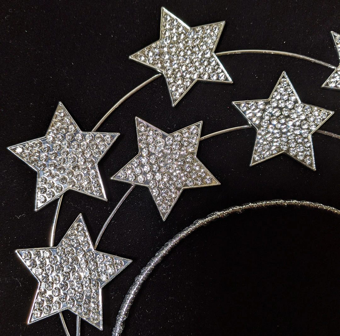Bold and dramatic, this is a perfect piece to add Old Hollywood glamour to your ensemble. The halo consists of two rows of silver-tone rhinestone encrusted starbursts atop a flexible headband.