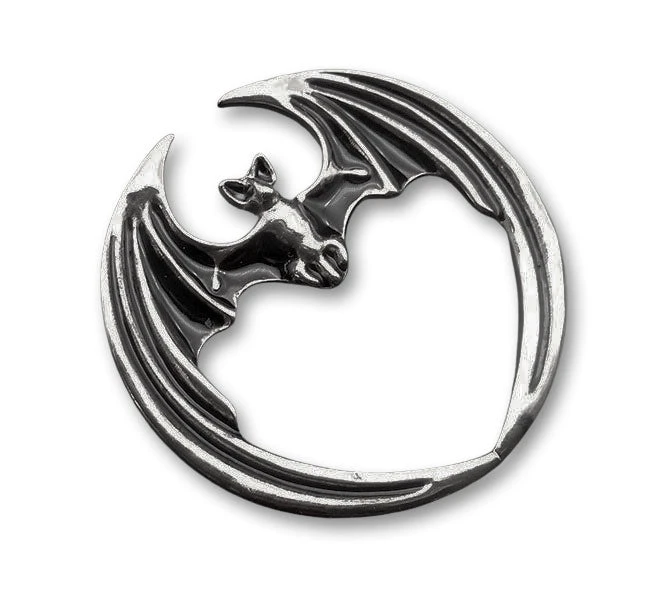 Features a silver tone bat with a pin back. Approximately 2 inches in diameter.