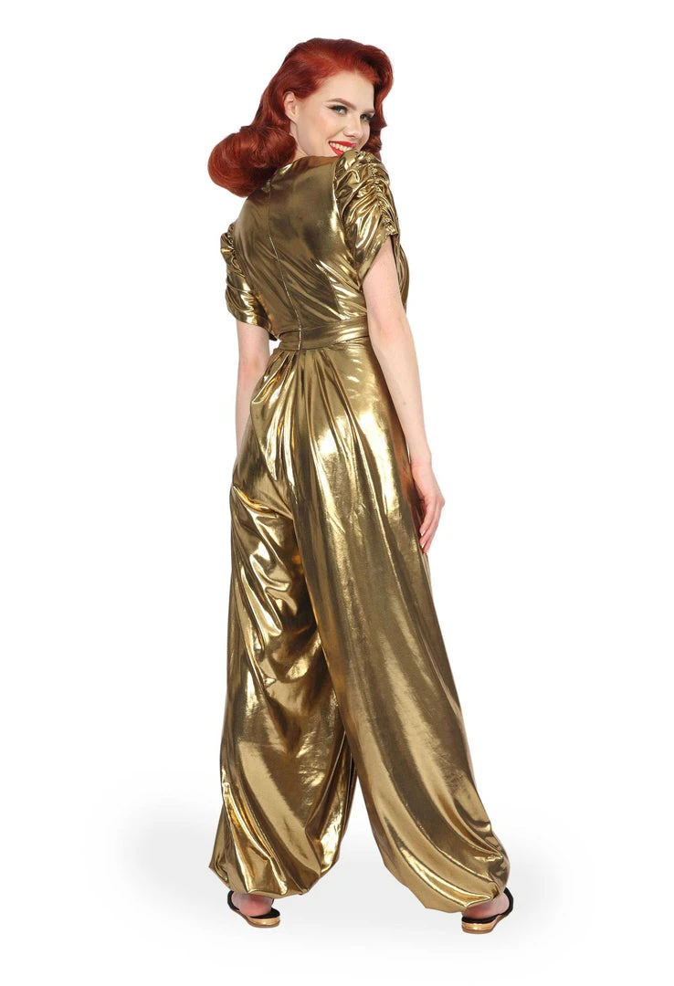 The Alhambra is an elegant, old Hollywood take on a creative avant garde design of 1939. This jumpsuit features late 30s style puff sleeves and beautiful ruching detail molded cups, full style “harem” style pant with elastic gathering at the angle and a center back zipper. The jumpsuit is made from comfortable gold metallic jersey.